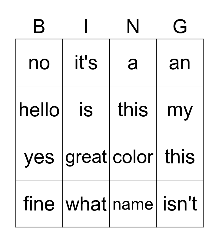 This bingo card has 16 words: what, this, a, no, yes, it's, color, name, hello, is, fine, an, great, my, this and isn't.