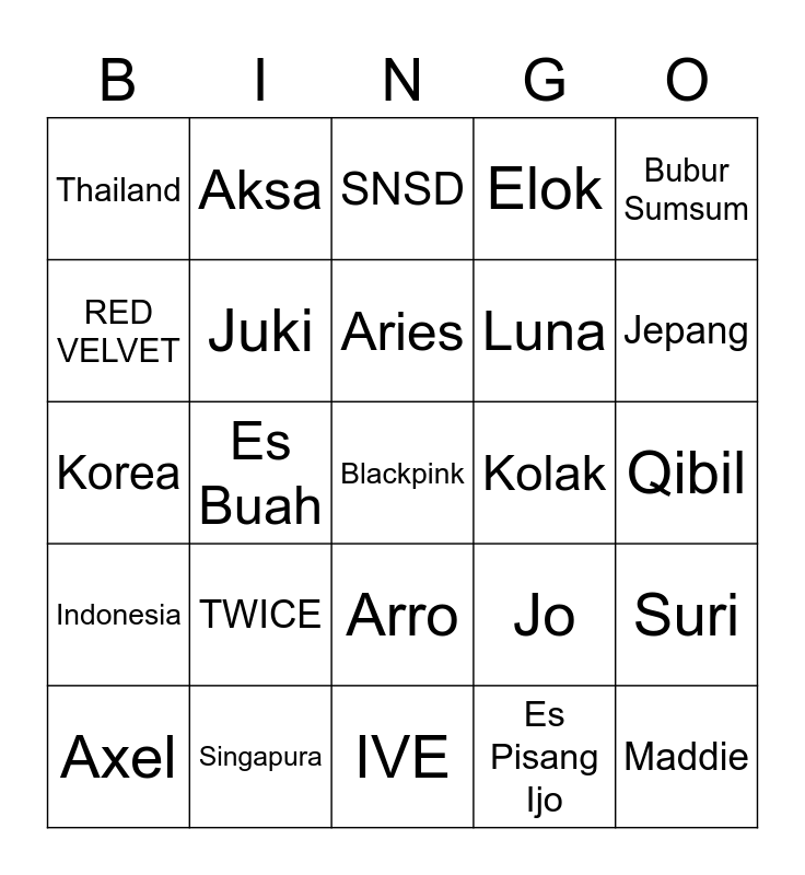 This bingo card has a free space and 24 words: TWICE, Singapura, Aries, Axel, Bubur Sumsum, Thailand, RED VELVET, Aksa, Kolak, Arro, Luna, Korea, Jo, Suri, Juki, Es Pisang Ijo, Qibil, SNSD, Jepang, Es Buah, Maddie, Indonesia, Elok and IVE.