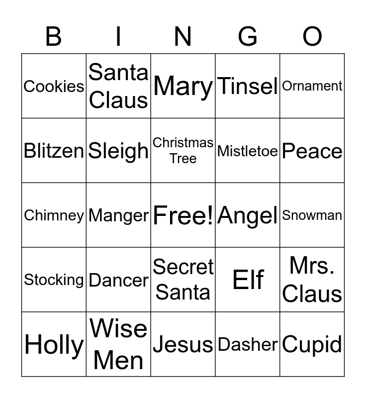 This bingo card has a free space and 53 words: Comet, Cupid, Donner, Dasher, Dancer, Prancer, Santa Claus, Vixen, Blitzen, Rudolph, Sleigh, Reindeer, Mrs. Claus, Elf, Frosty, Holly, Christmas Tree, Angel, Snow, Ornament, Manger, Garland, Mistletoe, Cookies, Shepard, Wise Men, Bethlehem, Star, Joy, Peace, Love, Believe, Jingle Bells, Ivy, Lights, Garland, Tinsel, Jesus, Mary, Joseph, Gabriel, Gifts, Snowman, Miracle, Tree Skirt, Secret Santa, Scrooge, Candy Cane, Chimney, Stocking, St. Nick, Toys and Ho Ho Ho.