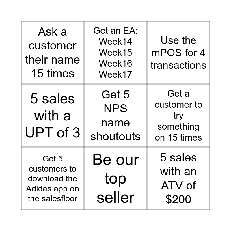 This bingo card has 9 words: Get 5 customers to download the Adidas app on the salesfloor, Use the mPOS for 4 transactions, Get an EA: Week14 Week15 Week16 Week17, 5 sales with a UPT of 3, Ask a customer their name 15 times, Get a customer to try something on 15 times, Get 5 NPS name shoutouts, 5 sales with an ATV of $200 and Be our top seller.