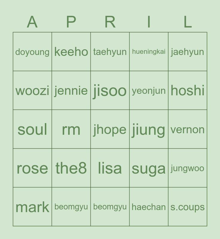 This bingo card has 25 words: the8, beomgyu, jisoo, mark, jaehyun, doyoung, woozi, keeho, jiung, lisa, yeonjun, soul, suga, jungwoo, jennie, s.coups, vernon, taehyun, hoshi, rm, jhope, beomgyu, rose, hueningkai and haechan.