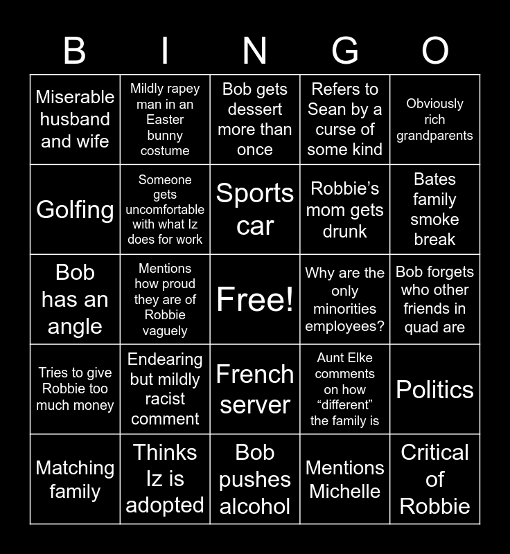 This bingo card has a free space and 24 words: Endearing but mildly racist comment, Thinks Iz is adopted, Sports car, Matching family, Obviously rich grandparents, Miserable husband and wife, Golfing, Mildly rapey man in an Easter bunny costume, Why are the only minorities employees?, French server, Robbie’s mom gets drunk, Bob has an angle, Aunt Elke comments on how “different” the family is, Politics, Someone gets uncomfortable with what Iz does for work, Mentions Michelle, Bob forgets who other friends in quad are, Bob gets dessert more than once, Bates family smoke break, Mentions how proud they are of Robbie vaguely, Critical of Robbie, Tries to give Robbie too much money, Refers to Sean by a curse of some kind and Bob pushes alcohol.