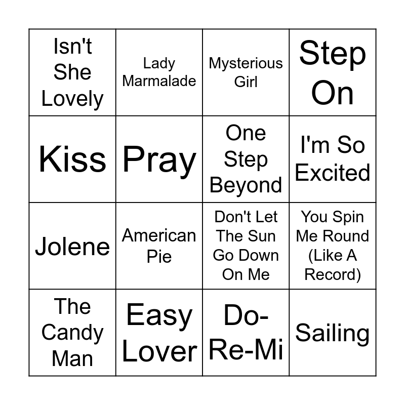This bingo card has 48 words: Hot Cross Buns, The Candy Man, Candy, I Am The Walrus, I'm Puttin' All My Eggs In One Basket, Ain't Nobody, Lady Marmalade, Think, Pray, Little Lion Man, One Step Beyond, Step On, Beat It, Heaven Is A Place On Earth, Video Killed The Radio Star, Red Red Wine, I'm So Excited, Easy Lover, West End Girls, Kiss, You Spin Me Round (Like A Record), White Wedding, Isn't She Lovely, Jolene, Love Is In The Air, American Pie, You Make Me Feel Like Dancing, Son Of A Preacher Man, Car Wash, Sailing, Sweet Home Alabama, The Boys Are Back In Town, It Takes Two, You'll Never Walk Alone, Hi Ho Silver Lining, My Boy Lollipop, Stop! In The Name Of Love, Do-Re-Mi, It's Not Unusual, This Old Heart Of Mine, Suspicious Minds, Sweets For My Sweet, Mysterious Girl, The Shoop Shoop Song, Don't Let The Sun Go Down On Me, Finally, Best Of Friends and I Just Can't Wait To Be King.