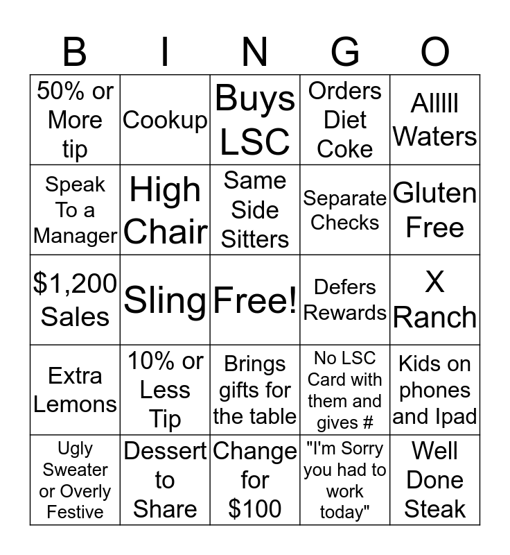 This bingo card has a free space and 24 words: 10% or Less Tip, Dessert to Share, Same Side Sitters, Ugly Sweater or Overly Festive, Alllll Waters, 50% or More tip, Speak To a Manager, Cookup, Defers Rewards, Brings gifts for the table, Separate Checks, $1,200 Sales, No LSC Card with them and gives #, Kids on phones and Ipad, High Chair, "I'm Sorry you had to work today", X Ranch, Buys LSC, Gluten Free, Sling, Well Done Steak, Extra Lemons, Orders Diet Coke and Change for $100.