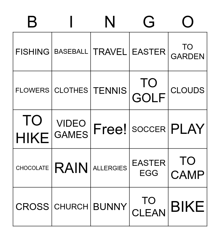 This bingo card has a free space and 29 words: CROSS, ICE CREAM, VIDEO GAMES, SPRING, FISHING, TRAVEL, CLOTHES, RAIN, SOCCER, CHURCH, PLAY, BIKE, BUNNY, TO CLEAN, CLOUDS, REST, ALLERGIES, CHOCOLATE, TO GARDEN, TO HIKE, EASTER EGG, BREAK, TO GOLF, FLOWERS, EASTER, BASEBALL, TO CAMP, TENNIS and CHURCH.