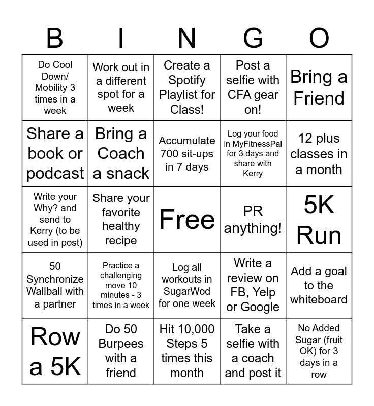 This bingo card has a free space and 24 words: Practice a challenging move 10 minutes - 3 times in a week, Do 50 Burpees with a friend, Accumulate 700 sit-ups in 7 days, Row a 5K, Bring a Friend, Do Cool Down/ Mobility 3 times in a week, Share a book or podcast, Work out in a different spot for a week, PR anything!, Log all workouts in SugarWod for one week, Log your food in MyFitnessPal for 3 days and share with Kerry, Write your Why? and send to Kerry (to be used in post), Write a review on FB, Yelp or Google, Add a goal to the whiteboard, Bring a Coach a snack, Take a selfie with a coach and post it, 5K Run, Create a Spotify Playlist for Class!, 12 plus classes in a month, Share your favorite healthy recipe, No Added Sugar (fruit OK) for 3 days in a row, 50 Synchronize Wallball with a partner, Post a selfie with CFA gear on! and Hit 10,000 Steps 5 times this month.
