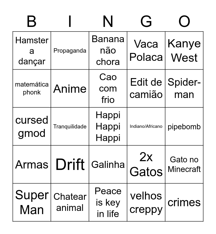 This bingo card has a free space and 24 words: Drift, Chatear animal, Cao com frio, Super Man, Kanye West, Hamster a dançar, matemática phonk, Propaganda, Indiano/Africano, Galinha, Edit de camião, cursed gmod, 2x Gatos, Gato no Minecraft, Anime, velhos creppy, pipebomb, Banana não chora, Spider-man, Tranquilidade, crimes, Armas, Vaca Polaca and Peace is key in life.