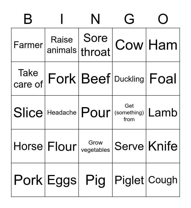 This bingo card has a free space and 24 words: Flour, Eggs, Beef, Pork, Ham, Farmer, Take care of, Raise animals, Get (something) from, Grow vegetables, Duckling, Slice, Serve, Knife, Fork, Piglet, Lamb, Sore throat, Foal, Headache, Cough, Horse, Cow and Pig.