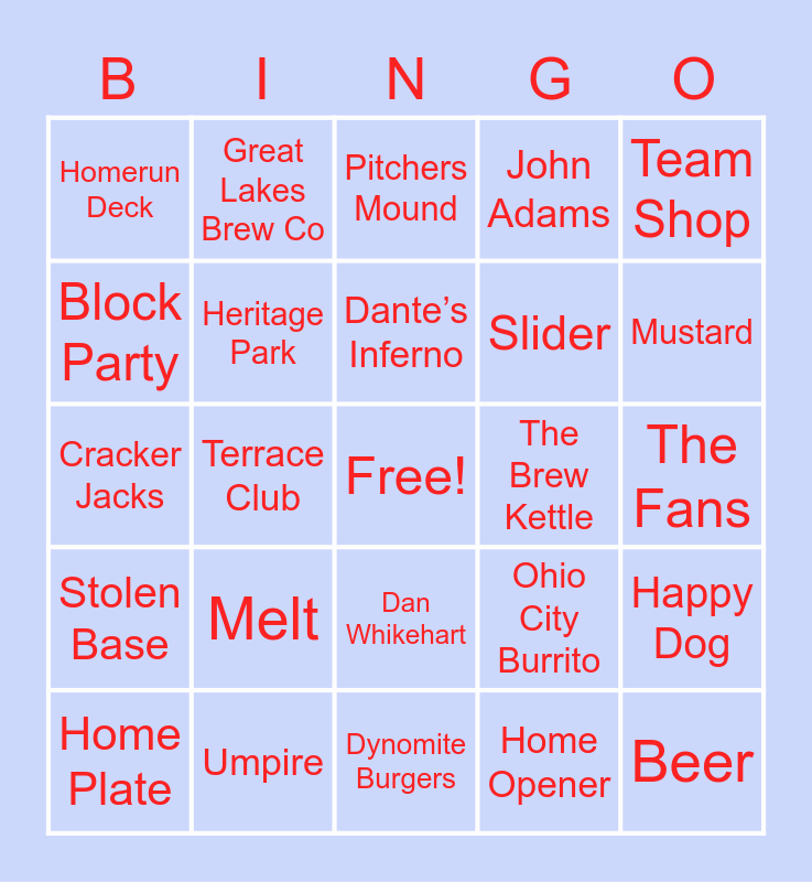 This bingo card has a free space and 51 words: Corner Bar, Beer, Barrio, Dynomite Burgers, Melt, Sweet Moses, Great Lakes Brew Co, Pregame in the District, Block Party, Bullpen, Heritage Park, John Adams, Happy Dog, Ohio City Burrito, Momocho, Fat Heads Brewery, Dante’s Inferno, The Brew Kettle, Family Deck, Team Shop, Terrace Club, Home Opener, Homerun Deck, Slider, Ketchup, Onion, Mustard, Club Seats, Home Plate, Pitchers Mound, Batter up, On Deck, In the hole, Home Run!, Bleachers, Umpire, Sandy Alomar, Terry Francona, Jose! Jose! Jose! Jose!, The wave, The Fans, Stolen Base, Strike out, Tom Hamilton, Beer Guy!, Peanuts, Cracker Jacks, 7th Inning Stretch, First Pitch, Dan Whikehart and Corner of Carnegie and Ontario.