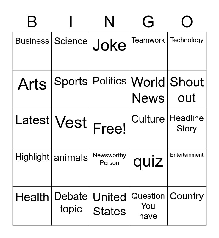 This bingo card has a free space and 25 words: animals, United States, Politics, Health, Technology, Business, Arts, Science, Culture, Newsworthy Person, World News, Latest, quiz, Entertainment, Sports, Positive, Headline Story, Joke, Shout out, Vest, Country, Debate topic, Highlight, Teamwork and Question You have.