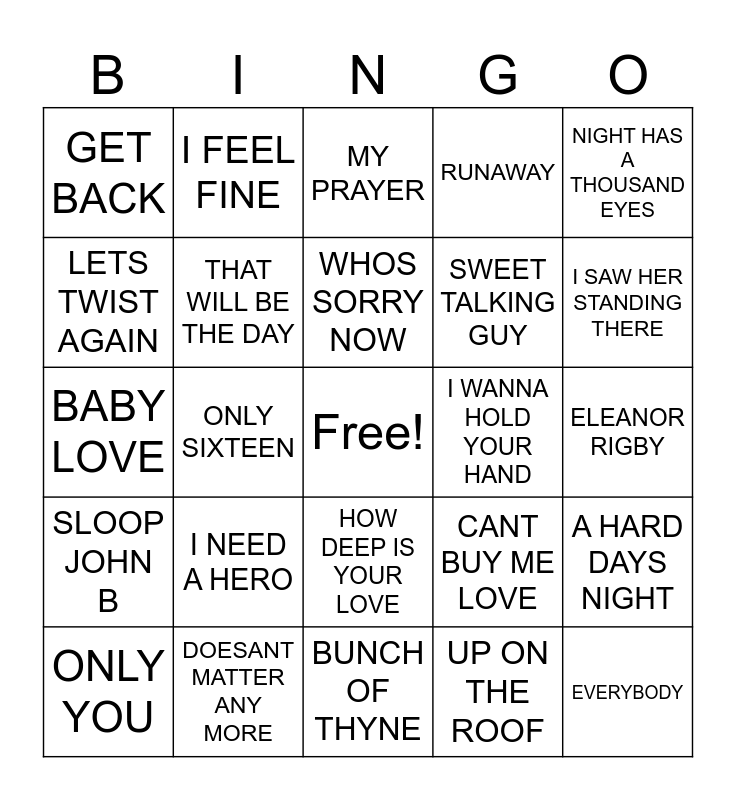 This bingo card has a free space and 43 words: DIANA, EVERYBODY, STAND BY ME, ONLY YOU, JUST WALKING IN THE RAIN, UP ON THE ROOF, MY PRAYER, SEALED WITH A KISS, NIGHT HAS A THOUSAND EYES, DOESANT MATTER ANY MORE, RUNAWAY, I WANNA HOLD YOUR HAND, HOW DEEP IS YOUR LOVE, I NEED A HERO, LOSING MY RELIGION, BUNCH OF THYNE, HOT IN THE CITY, BABY LOVE, COME ON EIEEN, I SAW HER STANDING THERE, I FEEL FINE, HEY JUDE, HELP, GET BACK, HELLO GOODBYE, ELEANOR RIGBY, FROM ME TO YOU, DAY TRIPPER, CANT BUY ME LOVE, SLOOP JOHN B, ALL YOU NEED I LOVE, A HARD DAYS NIGHT, HOUSE OF THE RISING SUN, ONLY SIXTEEN, MEMORIES ARE MADE OF THIS, DO YOU LOVE ME, ITS ONLY MAKE BELIEVE, WHOS SORRY NOW, LETS TWIST AGAIN, SWEET TALKING GUY, LIVING DOLL, THAT WILL BE THE DAY and LIPSTICK ON YOUR COLLAR.