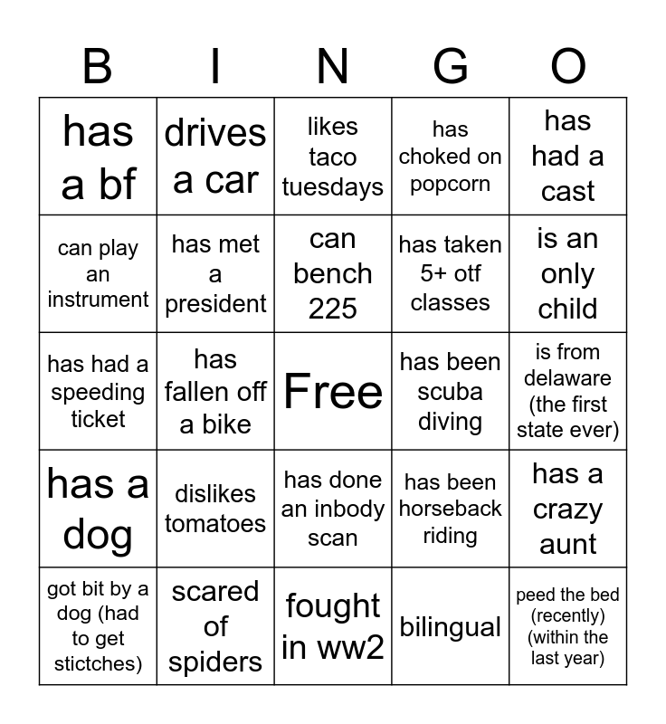 This bingo card has a free space and 24 words: dislikes tomatoes, scared of spiders, can bench 225, got bit by a dog (had to get stictches), has had a cast, has a bf, can play an instrument, drives a car, has been scuba diving, has done an inbody scan, has taken 5+ otf classes, has had a speeding ticket, has been horseback riding, has a crazy aunt, has met a president, bilingual, is from delaware (the first state ever), likes taco tuesdays, is an only child, has fallen off a bike, peed the bed (recently)(within the last year), has a dog, has choked on popcorn and fought in ww2.