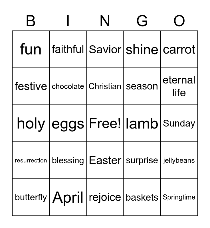 This bingo card has a free space and 32 words: baskets, bunny, eggs, peeps, resurrection, chocolate, carrot, jellybeans, faithful, egg hunt, Christian, Savior, bird, Jesus, lamb, flower, butterfly, holy, Easter, blessing, surprise, holy celebration, Sunday, April, Springtime, shine, season, festive, fun, rejoice, rebirth and eternal life.