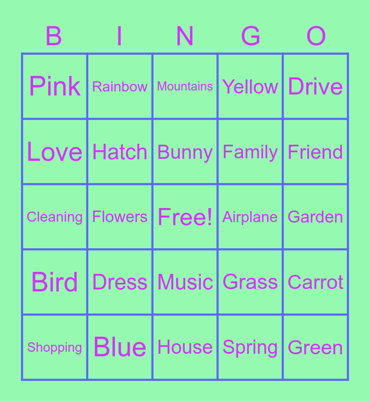 This bingo card has a free space and 32 words: Spring, Vacation, Flowers, Bloom, Bird, Hatch, Drive, Carrot, Rainbow, Rain, Bunny, Mountains, Beach, Travel, Airplane, Cloud, Shopping, Cleaning, Music, Dress, Grass, Bee, Garden, Blue, Green, Yellow, Family, Love, Pink, House, Bedroom and Friend.