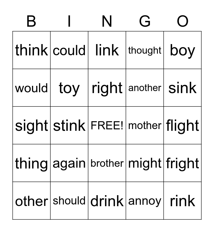 This bingo card has a free space and 24 words: again, should, right, other, boy, think, would, could, mother, brother, another, sight, might, fright, toy, annoy, flight, link, sink, stink, rink, thing, thought and drink.