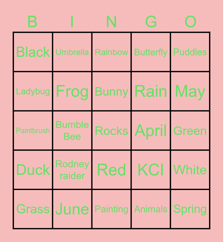 This bingo card has 33 words: Spring, Trees, Bumble Bee, Flowers, Duck, Frog, Puddles, Grass, Umbrella, Easter, Bunny, Rainbow, Bird, Sun, April, May, June, Paintbrush, Rodney raider, KCI, Red, Yellow, Black, Green, Painting, Rocks, Butterfly, Rain, Ladybug, White, Pink, Animals and Hibernation.