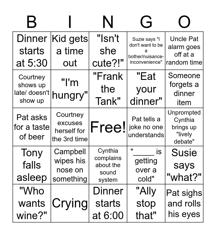 This bingo card has a free space and 32 words: "Ally stop that", Aunt C tells the story about hot mustard, Courtney excuses herself for the 3rd time, "Where's the baby?", Tony falls asleep, "I'm hungry", Uncle Pat alarm goes off at a random time, Susie says "what?", Kid gets a time out, "Alex why don't you like cranberries?", "Frank the Tank", "Isn't she cute?!", Courtney talks about what she's doing instead of a job, Cynthia gives us a recipe, Pat tells a joke no one understands, Cynthia corrects pronunciation (bonus pts if you're first), "Who wants wine?", Pat asks for a taste of beer, Cynthia complains about the sound system, Campbell wipes his nose on something, "_____ is getting over a cold", Scott tells a salty story about work, Unprompted Cynthia brings up "lively debate", Crying, Pat sighs and rolls his eyes, Suzie says "I don't want to be a bother/nuisance- inconvenience", "Eat your dinner", Courtney shows up late/ doesn't show up, Dinner starts at 5:30, Dinner starts at 6:00, Dinner starts at 6:30 and Someone forgets a dinner item.