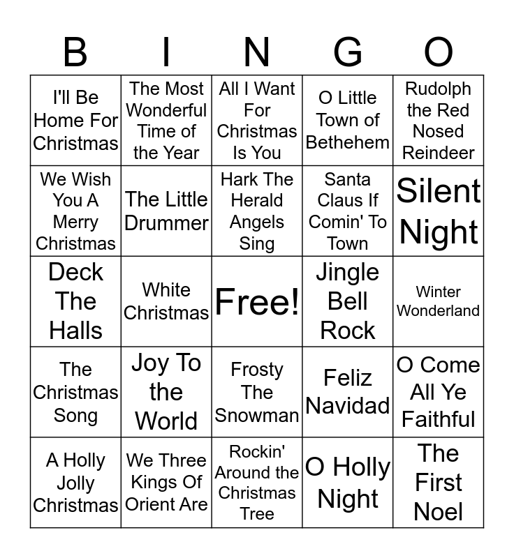 This bingo card has a free space and 24 words: Joy To the World, We Three Kings Of Orient Are, Hark The Herald Angels Sing, A Holly Jolly Christmas, Rudolph the Red Nosed Reindeer, I'll Be Home For Christmas, We Wish You A Merry Christmas, The Most Wonderful Time of the Year, Jingle Bell Rock, Frosty The Snowman, Santa Claus If Comin' To Town, Deck The Halls, Feliz Navidad, O Come All Ye Faithful, The Little Drummer, O Holly Night, Winter Wonderland, All I Want For Christmas Is You, Silent Night, White Christmas, The First Noel, The Christmas Song, O Little Town of Bethehem and Rockin' Around the Christmas Tree.