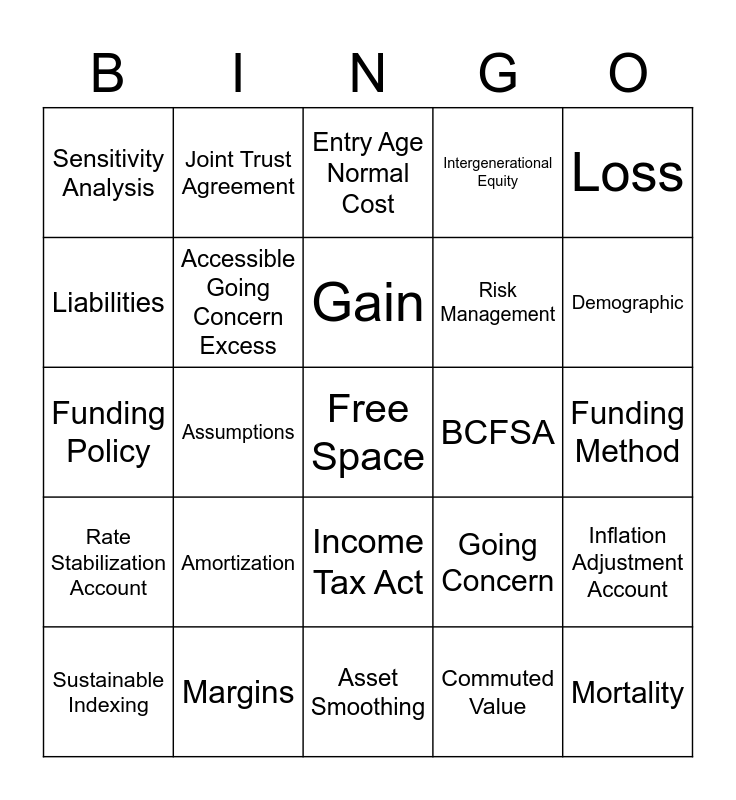 This bingo card has a free space and 27 words: Going Concern, Solvency, Risk Management, Asset Smoothing, Liabilities, Entry Age Normal Cost, Joint Trust Agreement, Rate Stabilization Account, BCFSA, Inflation Adjustment Account, Funding Policy, Intergenerational Equity, Sustainable Indexing, Margins, Demographic, Unfunded Liability, Accessible Going Concern Excess, Gain, Amortization, Sensitivity Analysis, Funding Method, Commuted Value, Assumptions, Mortality, Income Tax Act, Loss and Valuation.