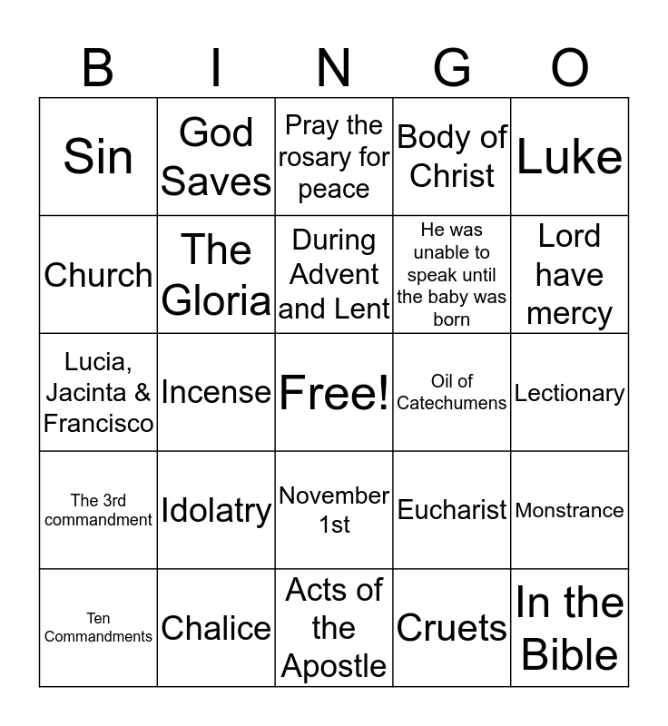 This bingo card has a free space and 24 words: Idolatry, Chalice, During Advent and Lent, Ten Commandments, Luke, Sin, Church, God Saves, Oil of Catechumens, November 1st, He was unable to speak until the baby was born, Lucia, Jacinta & Francisco, Eucharist, Monstrance, The Gloria, Cruets, Lectionary, Pray the rosary for peace, Lord have mercy, Incense, In the Bible, The 3rd commandment, Body of Christ and Acts of the Apostle.
