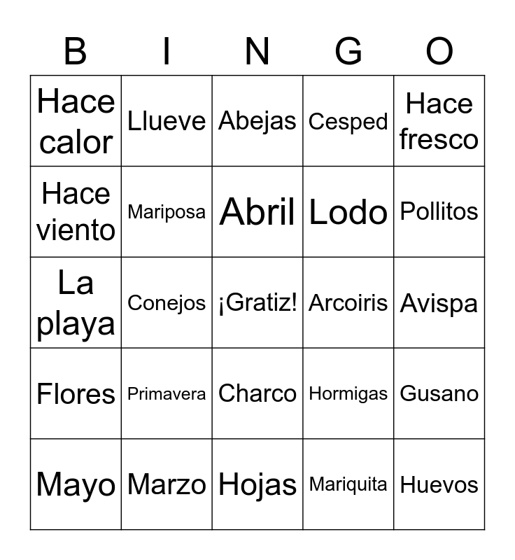 This bingo card has a free space and 24 words: Primavera, Marzo, Abril, Mayo, Hace fresco, Hace calor, Hace viento, Llueve, Arcoiris, Charco, Lodo, La playa, Hormigas, Gusano, Mariposa, Mariquita, Avispa, Abejas, Pollitos, Conejos, Huevos, Flores, Cesped and Hojas.