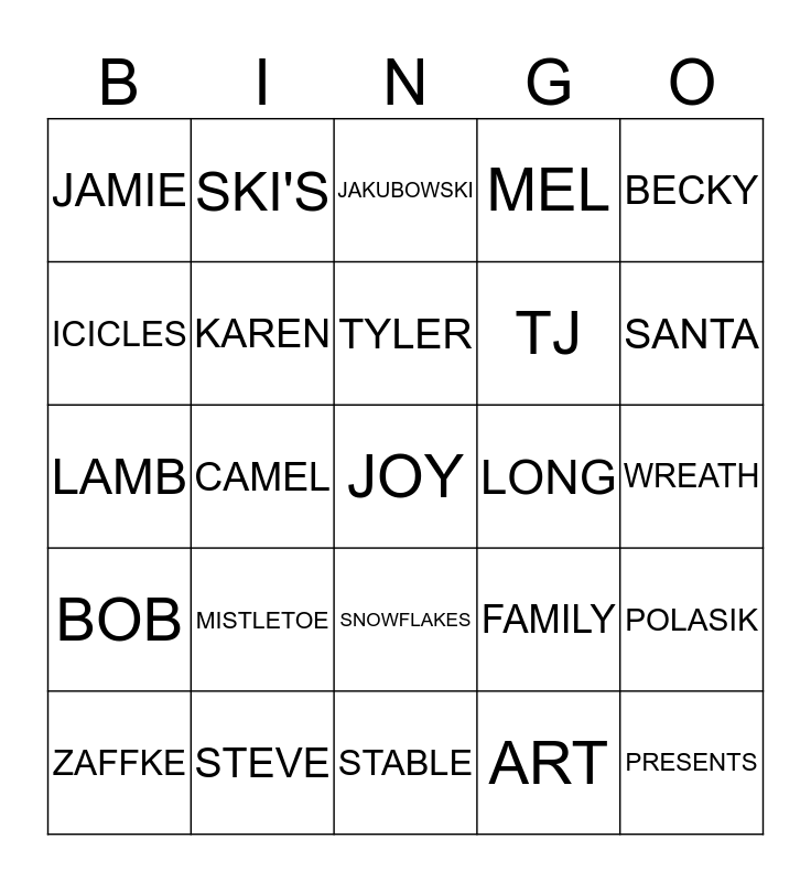 This bingo card has 58 words: GERI, STEVE, KIM, BOB, ART, AMBER, KAREN, GRANDMA J, TJ, TERRI, MEL, JAZ, Free!, NIMA, JASON, JAMIE, JOY, BECKY, BELLA, TYLER, LONG, JAKUBOWSKI, ZAFFKE, POLASIK, CHRISTMAS TREE, WREATH, LIGHTS, ANGELS, SANTA, CANDY CANE, STARS, SNOWMAN, SNOW, BABY JESUS, MARY, JOSEPH, 3 WISEMAN, CAMEL, LAMB, STOCKINGS, MISTLETOE, PRESENTS, FAMILY, NATIVITY, CHRISTMAS STORY, MRS CLAUS, GIVING, SNOWFLAKES, STABLE, COW, GREETING CARD, CHURCH, PRAYER, SLED, SKI'S, POINSETTIA, ICICLES and LOVE.