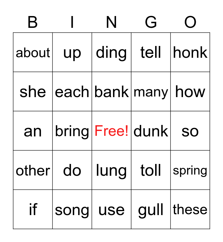 This bingo card has a free space and 34 words: pill, gull, stink, out, other, each, honk, if, up, will, bank, ding, there, which, dunk, how, song, an, do, toll, lung, them, about, so, use, these, tell, then, many, she, fall, bring, spring and were.