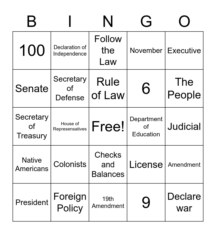 This bingo card has a free space and 64 words: Constitution, Bill of Rights, We the People, Amendment, 1st Amendment, 27, Declaration of Independence, Life, Liberty, and the Pursuit of Happiness, Rule of Law, Congress, Checks and Balances, Seperation of Power, Judicial, Executive, Legislative, Senate, House of Represensatives, 100, 435, 6, Colonists, Native Americans, November, Supreme Court, 6, 4, April, Joe Biden, Vice President, Speaker of the House, Commander in Chief of the Military, President, Cabinet, St. Paul, The People, President, Slavery, 9, Population, Secretary of Defense, Secretary of Treasury, Department of Education, Department of Homeland Security, Interpret the laws, Print money, Declare war, Foreign Policy, Education, License, Land use/zoning, Safety, Republicans and Democrats, 19th Amendment, 26th Amendment, Voting, Jury duty, Follow the Law, Susan B. Anthony, Civil Rights Movement, Red Lake, White Earth, Prairie Island, Upper Sioux and Lower Sioux.