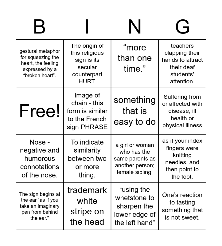 This bingo card has 16 words: trademark white stripe on the head, as if your index fingers were knitting needles, and then point to the foot., “more than one time.”, gestural metaphor for squeezing the heart, the feeling expressed by a “broken heart”., Nose - negative and humorous connotations of the nose., The origin of this religious sign is its secular counterpart HURT., a girl or woman who has the same parents as another person; female sibling., “using the whetstone to sharpen the lower edge of the left hand”, Free!, Image of chain - this form is similar to the French sign PHRASE, The sign begins at the ear “as if you take an imaginary pen from behind the ear.”, teachers clapping their hands to attract their deaf students’ attention., To indicate similarity between two or more thing., Suffering from or affected with disease, ill health or physical illness, something that is easy to do and One’s reaction to tasting something that is not sweet..