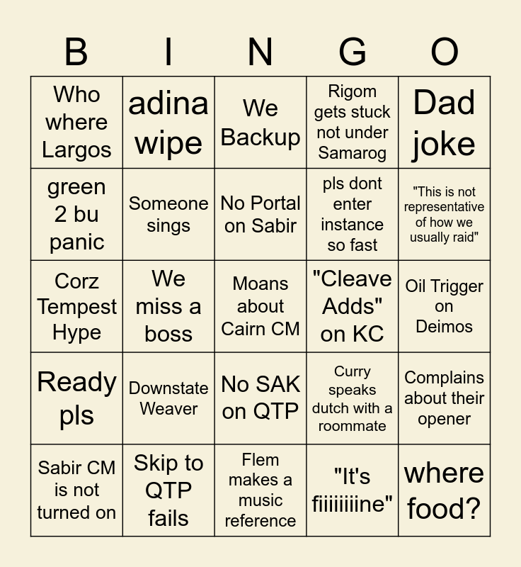 This bingo card has 42 words: Elliot goes down on SH, No Portal on Sabir, Flem asks how everyones weekend was, Downstate Weaver, "It's fiiiiiiiine", Complains about their opener, Moans about Cairn CM, Wrong Gear or Traits, We Backup, No SAK on QTP, Oil Trigger on Deimos, "This is not representative of how we usually raid", We miss a boss, Dad joke, Cat meow, Curry speaks dutch with a roommate, tbk grumpy about a minor thing, Corz Tempest Hype, ccedes, adina wipe, green 2 bu panic, unnecessary gg, where food?, Who where Largos, Accidental lamp, pls cleave statues on mo, pls dont enter instance so fast, tea has to bug flem about getting lieutenant to place markers, a rev at top cc on samarog, mick and tea have beef, Is cm on?, Ready pls, Someone sings, Flem makes a music reference, Tea says "weeee" whilst jumping/launching/yeeting, Sabir CM is not turned on, Skip to QTP fails, "Cleave Adds" on KC, We get a merge on KC, Tea and Lanux bonding over Cairn Hate, Rigom gets stuck not under Samarog and Tormented Dead gets yeeted (not by push).