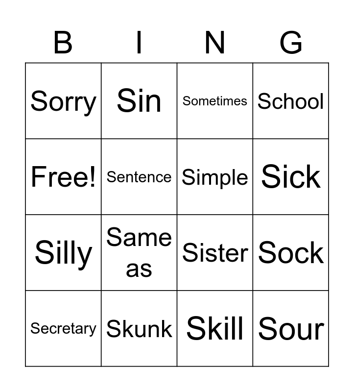 This bingo card has 16 words: Skunk, Sock, Sometimes, Sorry, Silly, Sin, Sister, Skill, Free!, Sentence, Secretary, School, Same as, Sick, Simple and Sour.