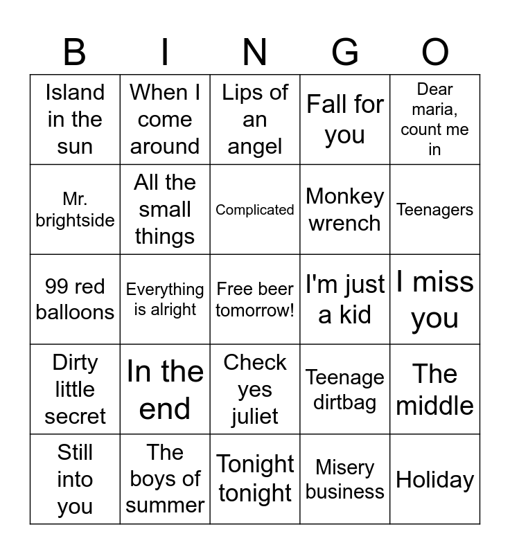 This bingo card has a free space and 40 words: 1985, 99 red balloons, All around me, All the small things, The boys of summer, Check yes juliet, Complicated, Dance, dance, Dear maria, count me in, Dirty little secret, Everything is alright, Fall for you, Holiday, I miss you, I'm just a kid, In the end, In too deep, Island in the sun, I write sins not tragedies, Lips of an angel, The middle, Misery business, Monkey wrench, Mr. brightside, My own worst enemy, Ocean avenue, Scotty doesn't know, Shake it, Sk8er boi, Somebody told me, Stacy's mom, Still into you, Sugar, we're going down, Teenage dirtbag, Teenagers, Tonight tonight, Wake me up when september ends, What's my age again?, When I come around and When you were young.