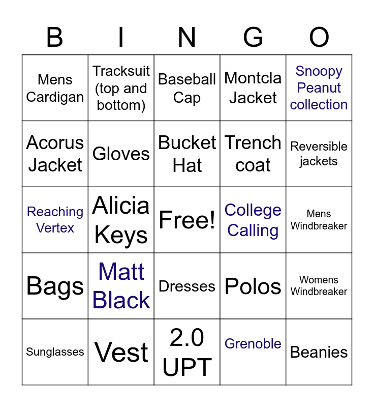This bingo card has a free space and 24 words: Matt Black, Vest, Bucket Hat, Sunglasses, Snoopy Peanut collection, Mens Cardigan, Acorus Jacket, Tracksuit (top and bottom), College Calling, Dresses, Trench coat, Reaching Vertex, Polos, Womens Windbreaker, Gloves, Grenoble, Mens Windbreaker, Baseball Cap, Reversible jackets, Alicia Keys, Beanies, Bags, Montcla Jacket and 2.0 UPT.
