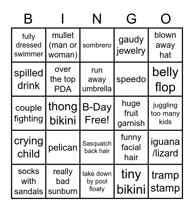 This bingo card has a free space and 28 words: iguana /lizard, combover, speedo, tiny bikini, spilled drink, sombrero, mullet (man or woman), crying child, huge fruit garnish, socks with sandals, couple fighting, gaudy jewelry, really bad sunburn, take down by pool floaty, belly flop, obnoxious nose sunscreen, pelican, over the top PDA, run away umbrella, Sasquatch back hair, fully dressed swimmer, super drunk in the AM, tramp stamp, thong bikini, juggling too many kids, funny facial hair, blown away hat and giant sun hat.