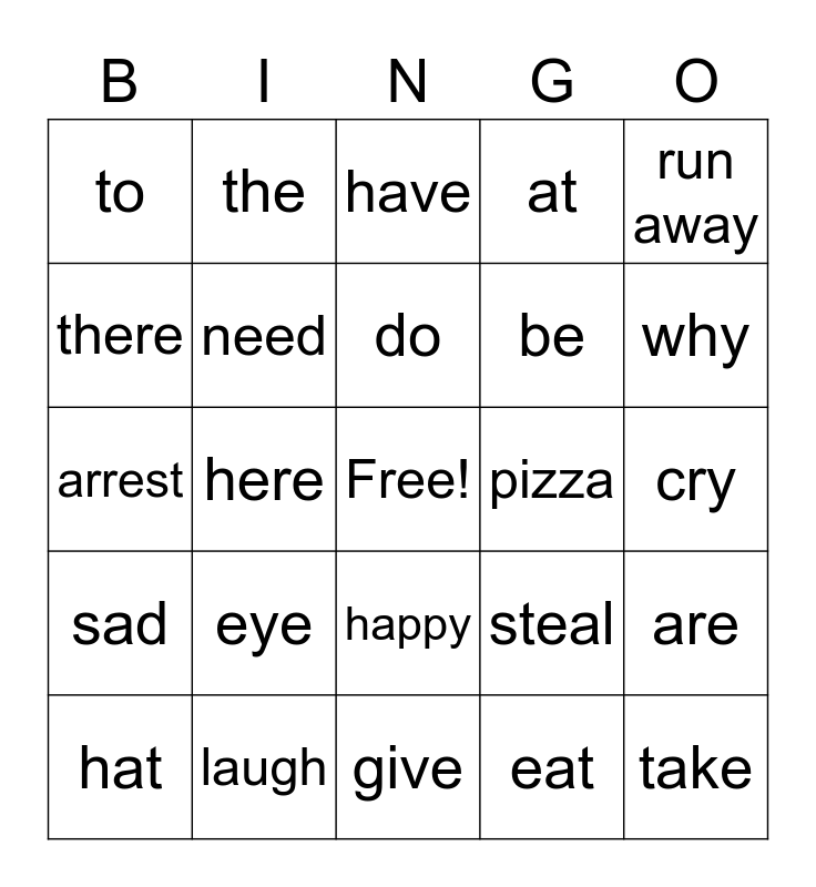 This bingo card has a free space and 29 words: hat, what, here, is, to, have, need, eye, pizza, laugh, cry, take, give, eat, why, because, happy, sad, run away, arrest, steal, throw, be, there, at, the, are, do and don't.