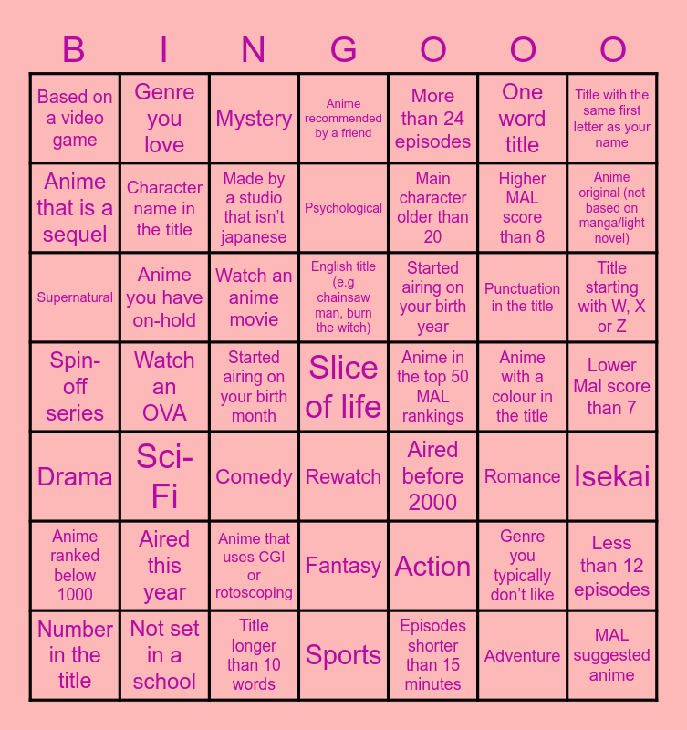 This bingo card has 49 words: Genre you typically don’t like, Higher MAL score than 8, Episodes shorter than 15 minutes, Watch an OVA, Watch an anime movie, Lower Mal score than 7, Genre you love, Title longer than 10 words, One word title, Rewatch, Title with the same first letter as your name, Anime recommended by a friend, Punctuation in the title, Started airing on your birth year, Aired this year, Anime with a colour in the title, Anime that is a sequel, Anime original (not based on manga/light novel), Less than 12 episodes, More than 24 episodes, Main character older than 20, Started airing on your birth month, Based on a video game, Character name in the title, Number in the title, Made by a studio that isn’t japanese, Title starting with W, X or Z, Not set in a school, English title (e.g chainsaw man, burn the witch), Anime you have on-hold, MAL suggested anime, Anime in the top 50 MAL rankings, Anime ranked below 1000, Anime that uses CGI or rotoscoping, Spin-off series, Aired before 2000, Romance, Isekai, Supernatural, Comedy, Fantasy, Drama, Slice of life, Sports, Psychological, Mystery, Action, Sci-Fi and Adventure.