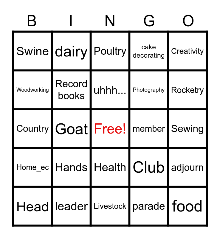 This bingo card has a free space and 29 words: Head, Shooting Sports, Goat, Beef, Swine, Poultry, Record books, Hands, member, leader, Sewing, food, Livestock, parade, Rocketry, Projects, Health, Home_ec, Creativity, Country, Club, County Fair, Photography, Woodworking, cake decorating, dairy, adjourn, uhhh... and announcement.