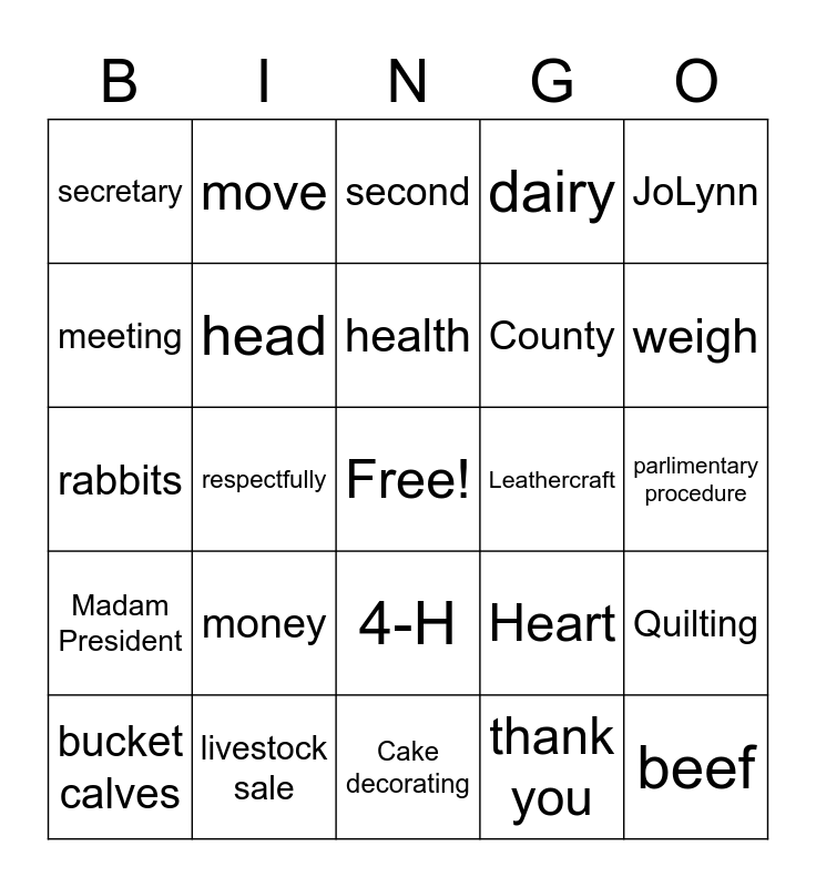 This bingo card has a free space and 27 words: Heart, State Fair, County, Cake decorating, meeting, second, move, Madam President, Leathercraft, Quilting, rabbits, dairy, bucket calves, livestock sale, weigh, fashion revue, head, health, money, secretary, parlimentary procedure, thank you, respectfully, beef, 4-H, JoLynn and Mr. Rutledge.