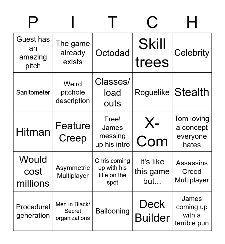 This bingo card has a free space and 24 words: Asymmetric Multiplayer, Men in Black/ Secret organizations, Classes/ load outs, Procedural generation, Celebrity, Guest has an amazing pitch, Sanitometer, The game already exists, X-Com, Chris coming up with his title on the spot, Roguelike, Hitman, It's like this game but..., Assassins Creed Multiplayer, Weird pitchole description, Deck Builder, Tom loving a concept everyone hates, Octodad, Stealth, Feature Creep, James coming up with a terrible pun, Would cost millions, Skill trees and Ballooning.