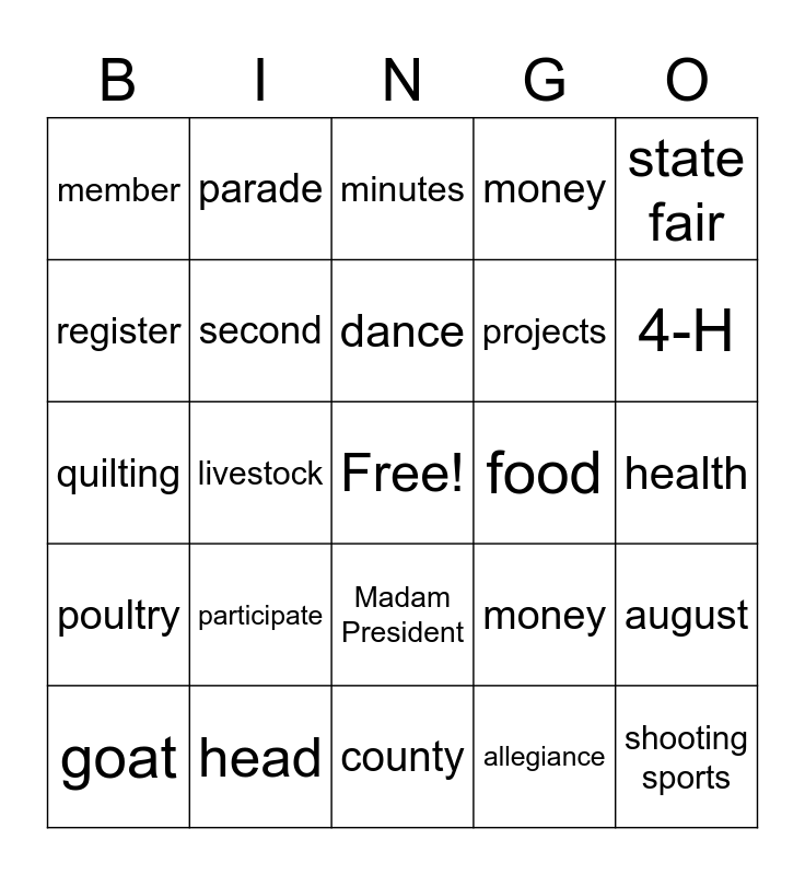 This bingo card has a free space and 29 words: goat, cake decoratin, livestock, committee, member, minutes, second, participate, food, head, health, shooting sports, county, allegiance, 4-H, thank you, Madam President, poultry, state fair, quilting, money, home ec, projects, register, money, parade, august, dance and photography.