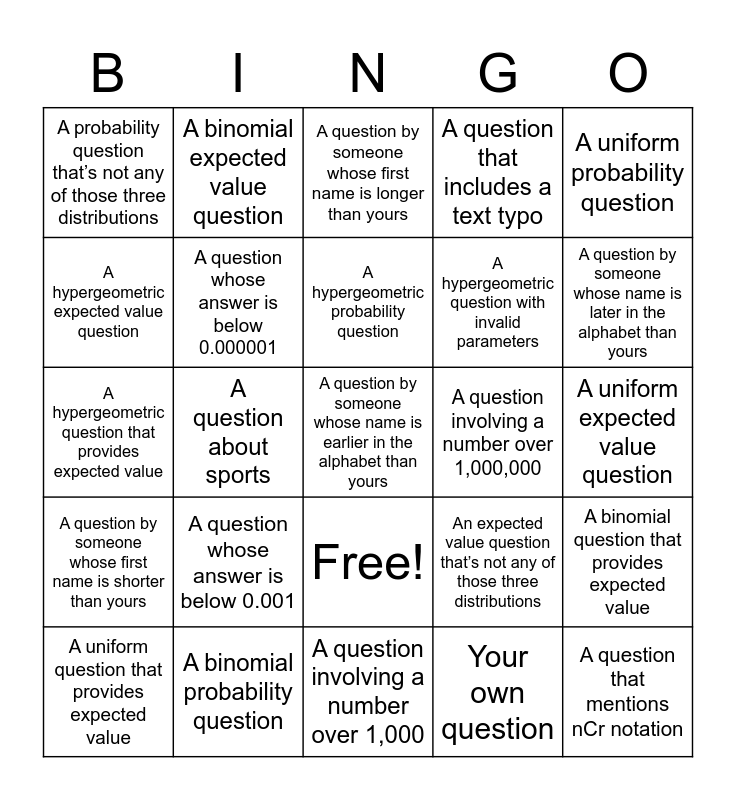 This bingo card has 26 words: Free!, Your own question, A hypergeometric probability question, A binomial probability question, A uniform probability question, A probability question that’s not any of those three distributions, A hypergeometric expected value question, A binomial expected value question, A uniform expected value question, An expected value question that’s not any of those three distributions, A hypergeometric question with invalid parameters, A hypergeometric question that provides expected value, A binomial question that provides expected value, A uniform question that provides expected value, A question about sports, A question about animals or plants, A question that includes a text typo, A question by someone whose first name is shorter than yours, A question by someone whose first name is longer than yours, A question by someone whose name is earlier in the alphabet than yours, A question by someone whose name is later in the alphabet than yours, A question involving a number over 1,000, A question involving a number over 1,000,000, A question whose answer is below 0.001, A question whose answer is below 0.000001 and A question that mentions nCr notation.