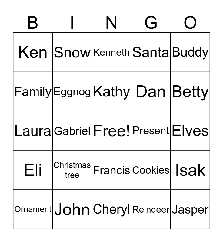 This bingo card has a free space and 24 words: Christmas tree, John, Kathy, Ornament, Buddy, Ken, Family, Snow, Present, Francis, Dan, Laura, Cookies, Isak, Eggnog, Reindeer, Elves, Kenneth, Betty, Gabriel, Jasper, Eli, Santa and Cheryl.