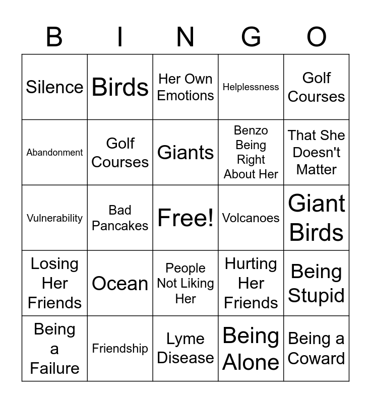 This bingo card has a free space and 24 words: Ocean, Friendship, Giants, Being a Failure, Golf Courses, Silence, Abandonment, Birds, Volcanoes, People Not Liking Her, Benzo Being Right About Her, Vulnerability, Hurting Her Friends, Being Stupid, Golf Courses, Being Alone, Giant Birds, Her Own Emotions, That She Doesn't Matter, Bad Pancakes, Being a Coward, Losing Her Friends, Helplessness and Lyme Disease.
