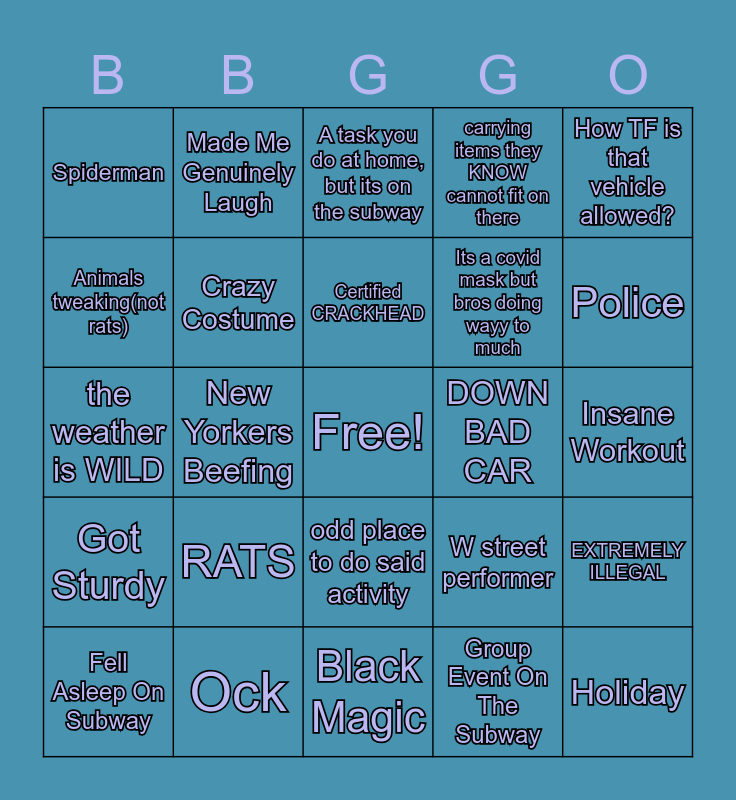 This bingo card has a free space and 24 words: RATS, Ock, Certified CRACKHEAD, Fell Asleep On Subway, How TF is that vehicle allowed?, Spiderman, Animals tweaking(not rats), Made Me Genuinely Laugh, DOWN BAD CAR, odd place to do said activity, Its a covid mask but bros doing wayy to much, the weather is WILD, W street performer, EXTREMELY ILLEGAL, Crazy Costume, Group Event On The Subway, Insane Workout, A task you do at home, but its on the subway, Police, New Yorkers Beefing, Holiday, Got Sturdy, carrying items they KNOW cannot fit on there and Black Magic.