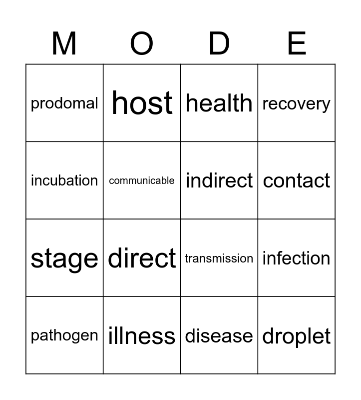 This bingo card has 16 words: illness, infection, health, prodomal, stage, host, transmission, disease, incubation, communicable, pathogen, recovery, direct, contact, indirect and droplet.