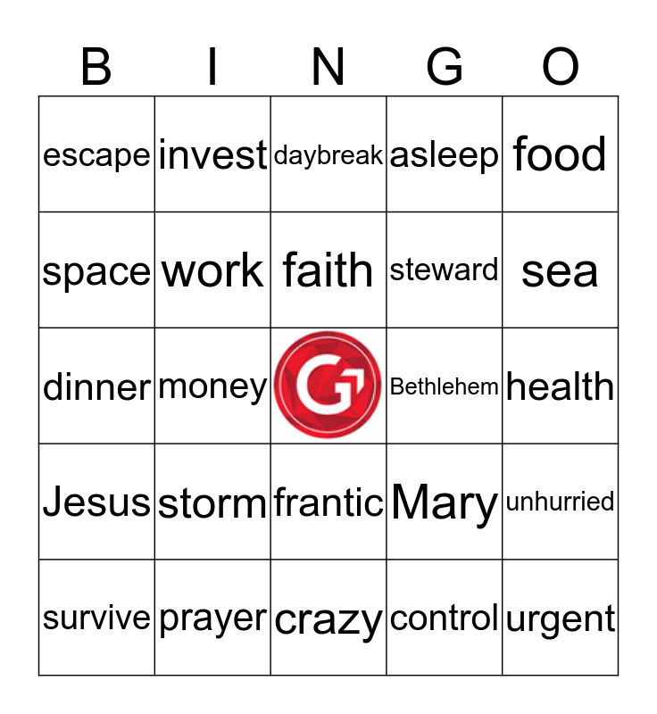 This bingo card has a free space and 24 words: storm, prayer, faith, survive, food, escape, space, invest, Bethlehem, frantic, steward, dinner, Mary, unhurried, work, control, health, daybreak, sea, money, urgent, Jesus, asleep and crazy.