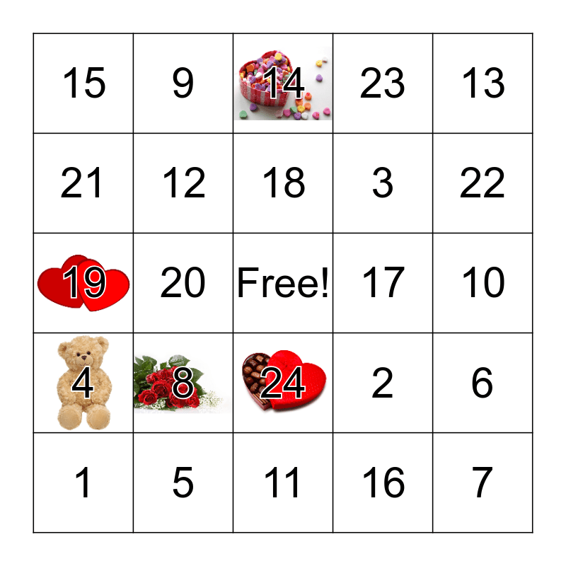 This bingo card has 5 images, a free space and 24 words: 8, 5, 18, 1, 13, 15, 21, 9, 17, 24, 3, 19, 2, 6, 12, 16, 10, 14, 22, 20, 7, 4, 23 and 11.