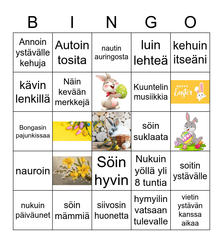 This bingo card has 5 images, a free space and 19 words: söin mämmiä, nukuin päiväunet, kehuin itseäni, Annoin ystävälle kehuja, kävin lenkillä, Autoin tosita, söin suklaata, Söin hyvin, Kuuntelin musiikkia, Bongasin pajunkissaa, Nukuin yöllä yli 8 tuntia, soitin ystävälle, Näin kevään merkkejä, hymyilin vatsaan tulevalle, nautin auringosta, vietin ystävän kanssa aikaa, nauroin, luin lehteä and siivosin huonetta.