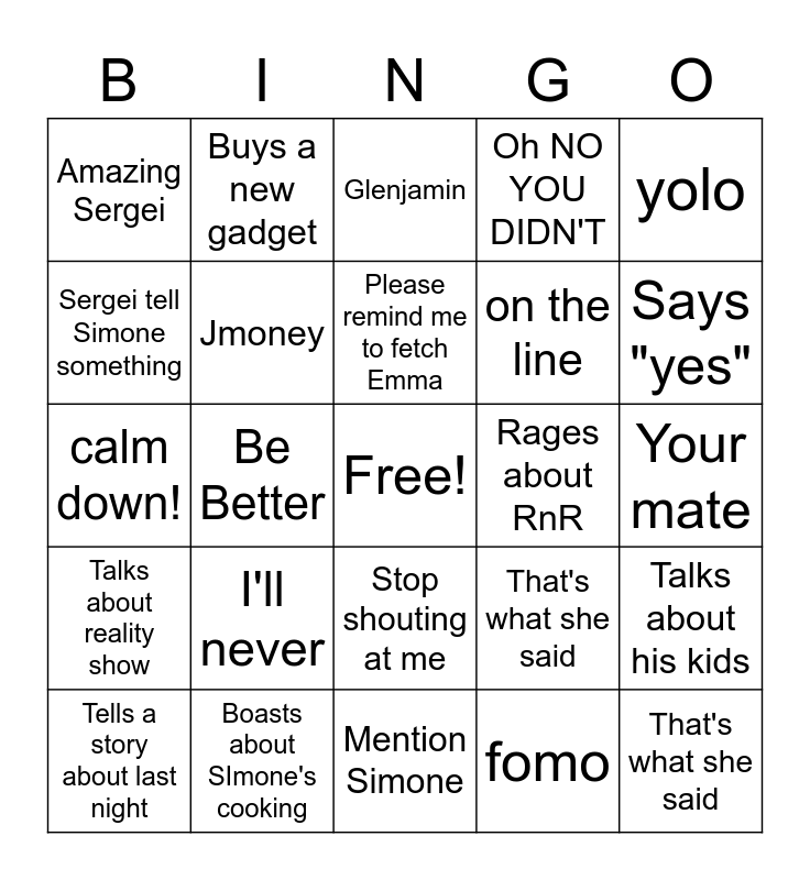 This bingo card has a free space and 24 words: I'll never, Boasts about SImone's cooking, Please remind me to fetch Emma, Tells a story about last night, yolo, Amazing Sergei, Sergei tell Simone something, Buys a new gadget, Rages about RnR, Stop shouting at me, on the line, calm down!, That's what she said, Talks about his kids, Jmoney, fomo, Your mate, Glenjamin, Says "yes", Be Better, That's what she said, Talks about reality show, Oh NO YOU DIDN'T and Mention Simone.