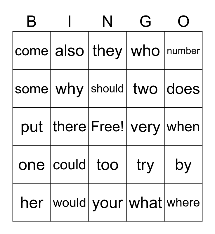 This bingo card has a free space and 24 words: could, would, should, her, number, come, some, also, very, too, two, put, try, by, why, what, when, they, does, there, where, one, who and your.